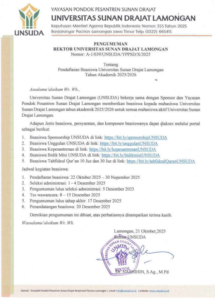 Universitas Sunan Drajat Lamongan (UNSUDA) bekerja sama dengan Sponsor dan Yayasan Pondok Pesantren Sunan Drajat Lamongan memberikan beasiswa kepada mahasiswa Universitas Sunan Drajat Lamongan tahun akademik 2025/2026 untuk semua mahasiswa aktif Universitas Sunan Drajat Lamongan.